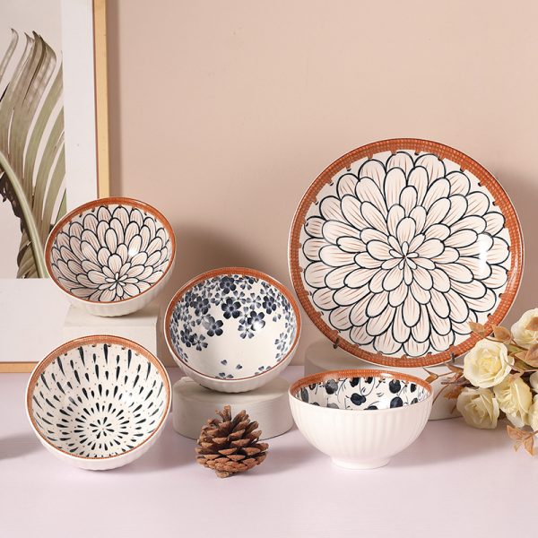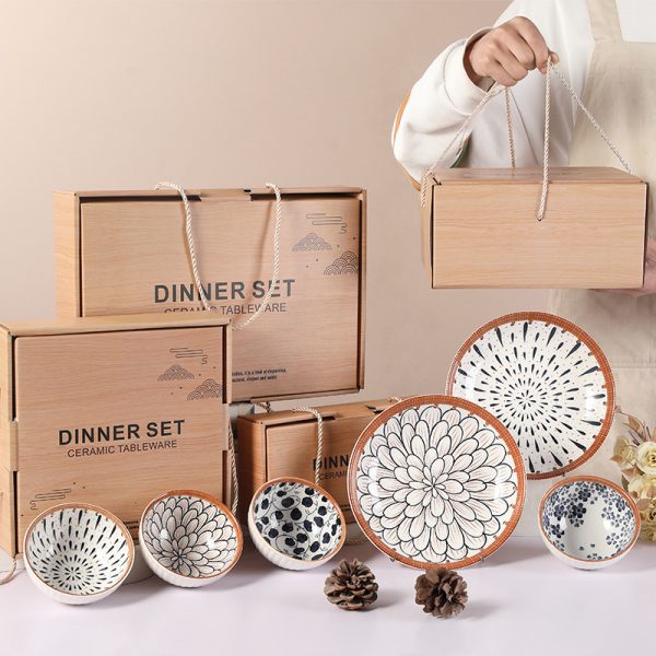Cross-border Wood Grain Printed Ceramic Tableware Set, the perfect gift package that includes bowls, chopsticks, plates, and a complete ceramic bowl set.