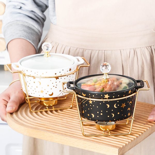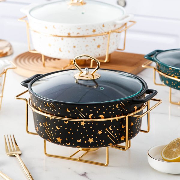 Nordic Double-Handled Ceramic Pot with Starry Golden Patterns – a versatile cooking essential that will revolutionize your kitchen. Crafted with utmost precision, this multipurpose pot can be used for soups, stews, dry pot dishes, and even as a decorative centerpiece.